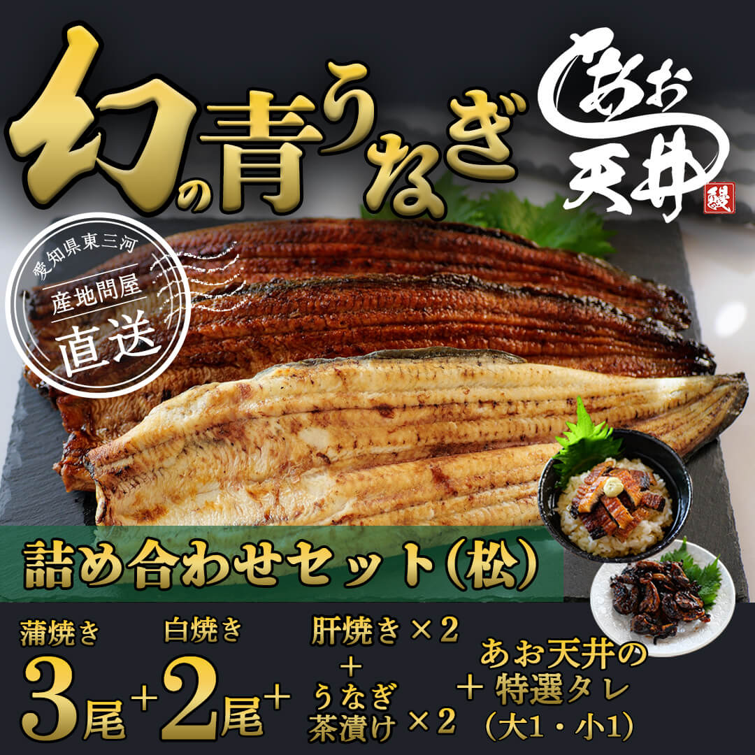 あお天井自慢の“幻の青うなぎ”を贅沢に詰め合わせた特選セット。蒲焼きや白焼き、肝焼き、うなぎ茶漬けなど、素材と職人技のこだわりを一箱に凝縮。用途や人数に合わせて「松・竹・梅」からお選びいただけます。ギフトにも最適です。