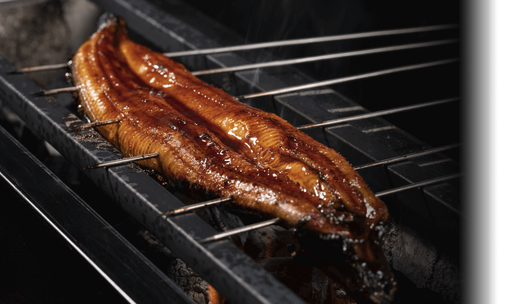 次に温度を徐々に下げ、じっくりと身に火を通し、うなぎが約140~160gになるまでしっかり丁寧に余分な脂を落とし焼き込みます。
